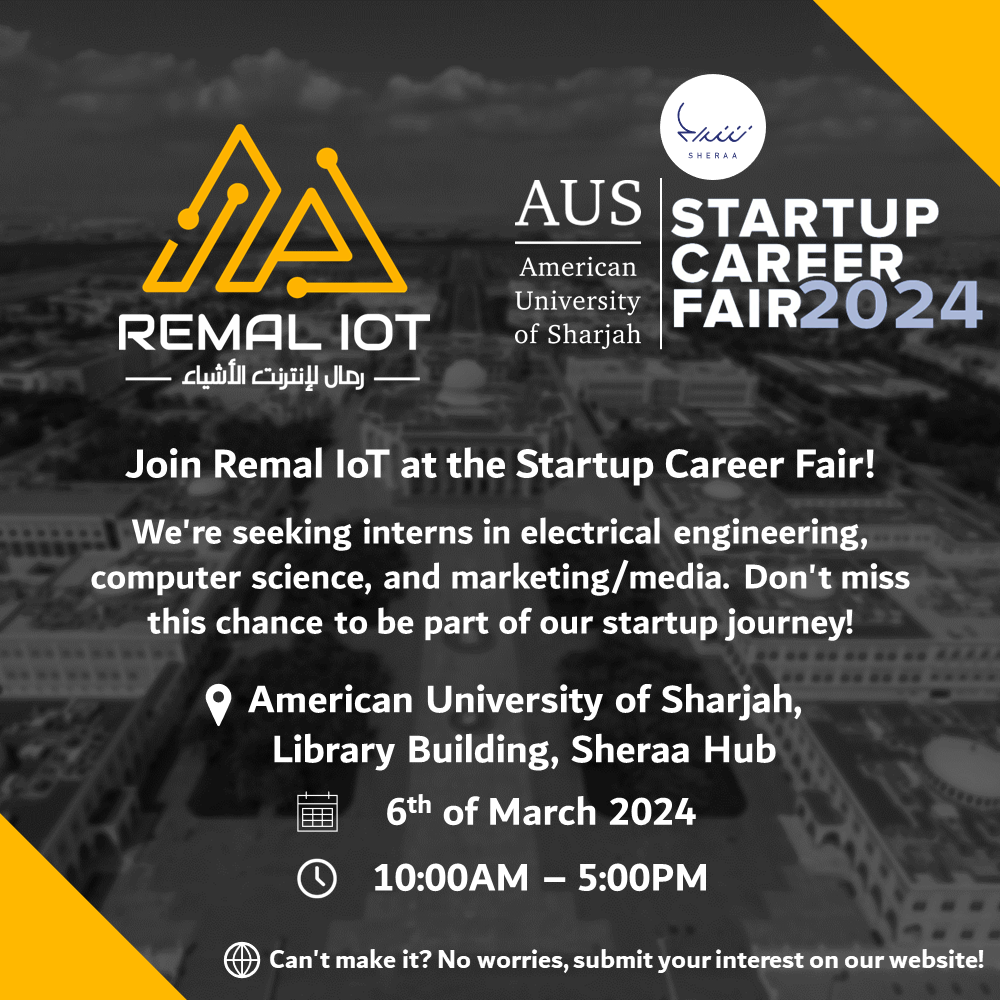 Catch us at the AUS Startup Career Fair tomorrow! Remal IoT is scouting for driven interns in electrical engineering, computer science, and marketing/media. Passionate about tech from another field? We want to meet you too! Join our journey and make an impact in IoT. Can’t make it? No worries, submit your interest in interning here!